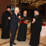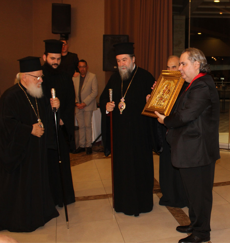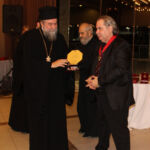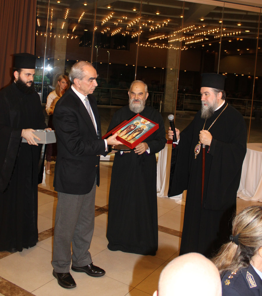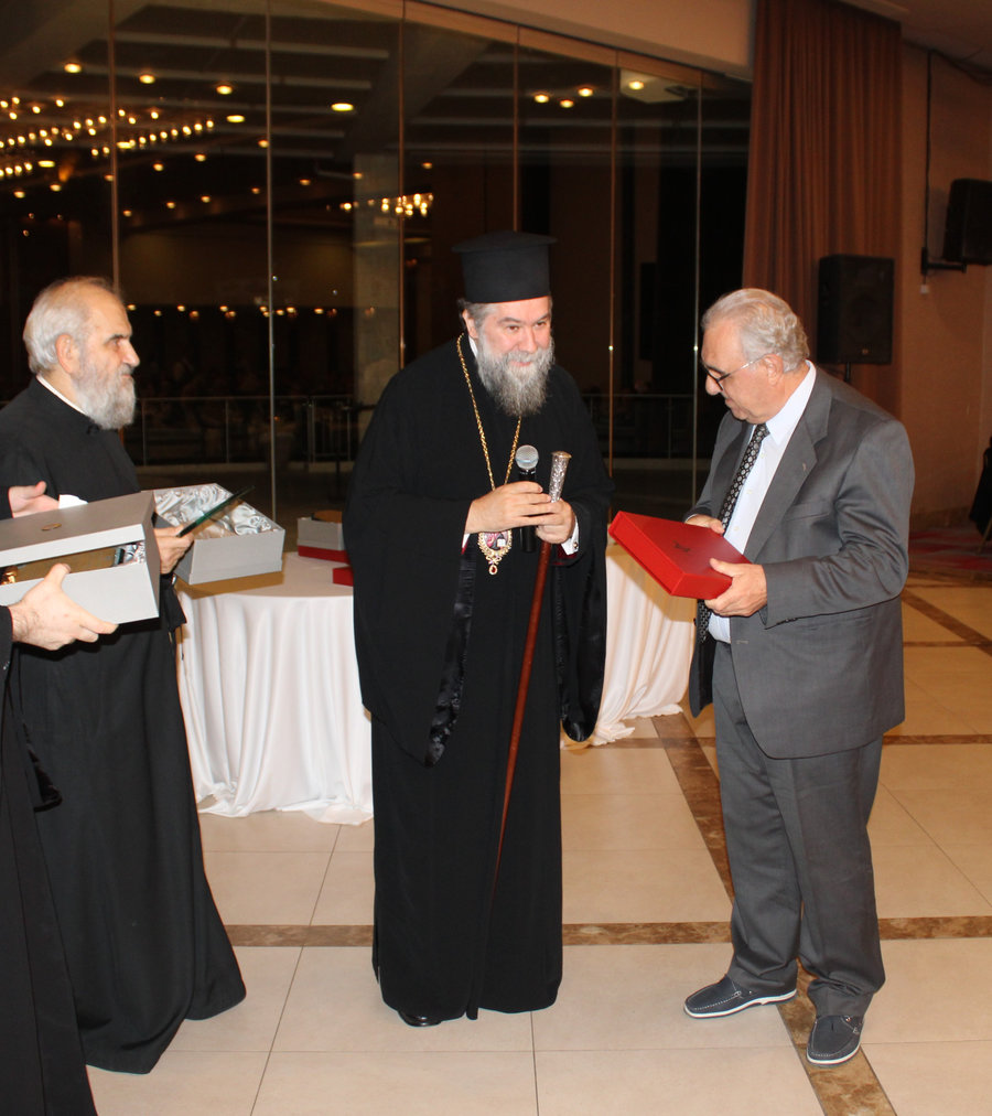Στην αντιφώνησή του, ο κ. Αμοργιανός, εξέφρασε την βαθιά συγκίνηση, τον σεβασμό και τις ευχαριστίες του προς τον Σεβασμιώτατο και τους συνεργάτες του για την πρόσκληση να παρευρίσκεται σ’ αυτήν την μεγαλειώδη, όπως είπε, συνεστίαση της τοπικής Εκκλησίας, αλλά και για την προσφερομένη μεγάλη τιμή στο πρόσωπό του, γεγονός το οποίο, πολύ τον εχαροποίησε και τον ανέπαυσε πνευματικώς. Ο τιμηθείς Διευθυντής προσέφερε ευγνωμόνως στον Σεβ. κ. Θεολόγο πιστό αντίγραφο της ιεράς εικόνος Παναγίας «Ιεροσολυμιτίσσης», καθώς και έναν πίνακα με τα εμβλήματα του Ωδείου Πειραιώς.