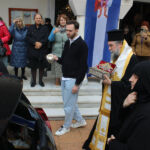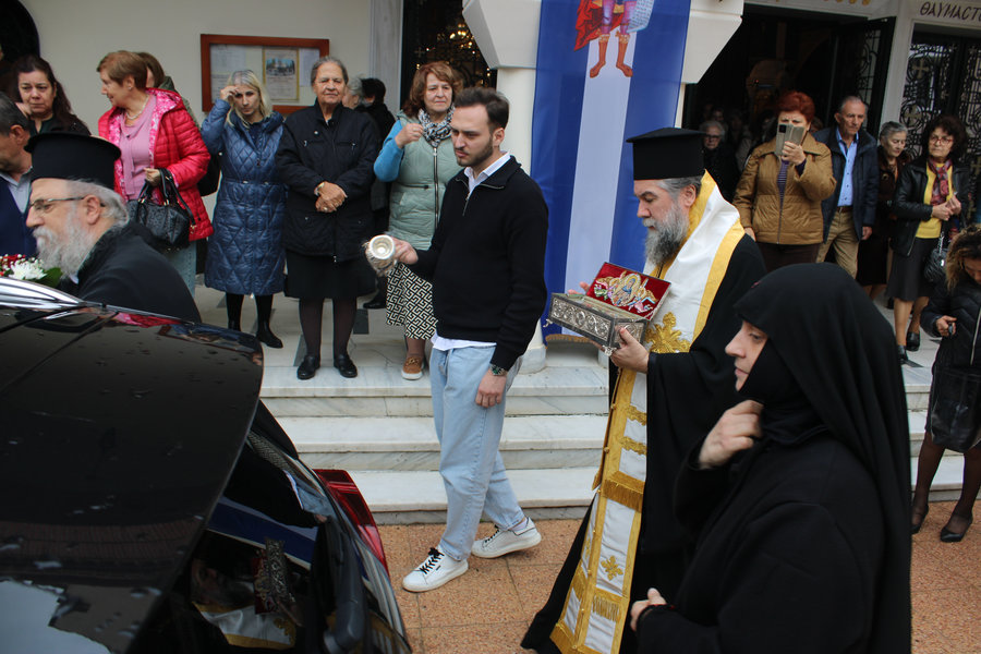 Ακολούθως, στις 12:30 το μεσημέρι, στον ιερό Μητροπολιτικό Ναό Παμμ. Ταξιαρχών Σερρών, πραγματοποιήθηκε η αναχώρηση του θαυματοβρύτου αποτμήματος εκ της αριστεράς χειρός του οσίου Παταπίου, για την ομώνυμο ιερά Μονή Λουτρακίου της Αποστολικής Μητροπόλεως Κορίνθου, με την συμπροσευχητική παρουσία του ευαγούς κλήρου και των ευλαβών προσκυνητών, από την πόλη των Σερρών, την ευρύτερη περιοχή και τους γειτονικούς Νομούς, οι οποίοι, όλες αυτές τις ημέρες, προσήλθαν με έναν εντυπωσιακώς συγκινητικό τρόπο και αριθμό για να προσκυνήσουν και να συμμετάσχουν στις ιερές ακολουθίες με αισθήματα ιεράς συγκινήσεως και εν Χριστώ ευγνωμοσύνης, στο πλαίσιο του πανευφροσύνου και πανδήμου εορτασμού της ιεράς συνάξεως των Αρχιστρατήγων Μιχαήλ και Γαβριήλ και πασών των επουρανίων Δυνάμεων Ασωμάτων, προστατών και εφόρων της πόλεως των Σερρών.