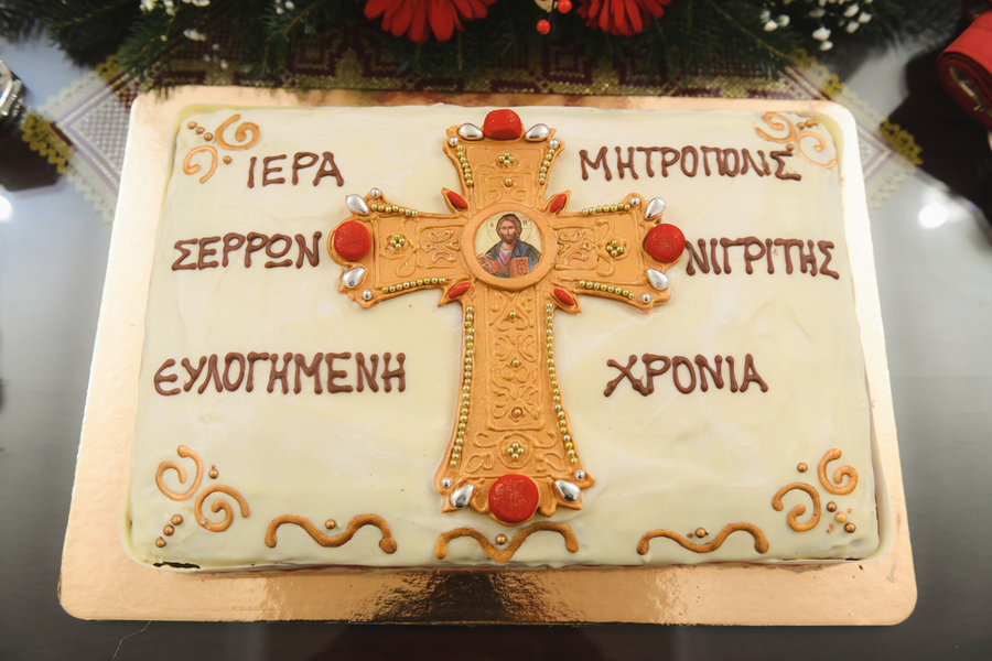 Στη συνέχεια, ο Σεβασμιώτατος διένειμε σε όλους τα ευλογημένα τεμάχια της Αγιοβασιλειόπιτας, τα φλουριά της οποίας έλαχαν η Δήμαρχος Σερραίων κ. Βαρβάρα Μητλιάγκα και ο Πρόεδρος της Ο.Ε.Β.Ε.Σ. Ν. Σερρών κ. Σωτήριος Κοτσαμπάς, οι οποίοι έλαβαν, από τον Σεβασμιώτατο, ως ευλογία, ακριβές αντίγραφο της Παναγίας «ΠΟΝΟΛΥΤΡΙΑΣ», της Οποίας το χαριτόβρυτο και θαυματουργό, ανάγλυφο εικόνισμα (11ος μ.Χ. αιών) φυλάσσεται στον ιερό Καθεδρικό και Προσκυνηματικό Ναό Αγ. Θεοδώρων Σερρών καθώς και επετειακό πινάκιο, διασώζον την εξέχουσα και εμβληματική προσωπικότητα του μεγάλου Σερραίου Αρχιστρατήγου και πρωτεργάτου της εθνικής παλιγγενεσίας του 1821 στην μαρτυρική Μακεδονία, Εμμ. Παπά.