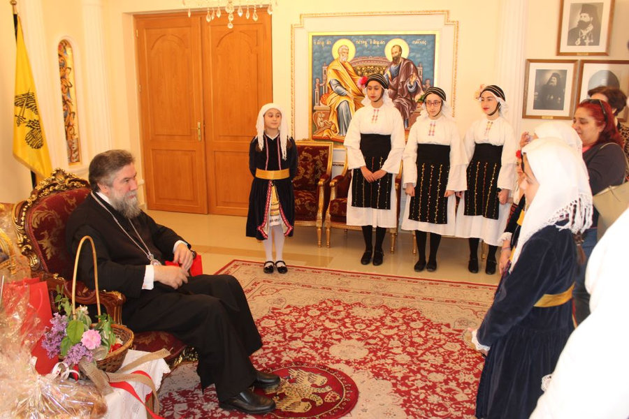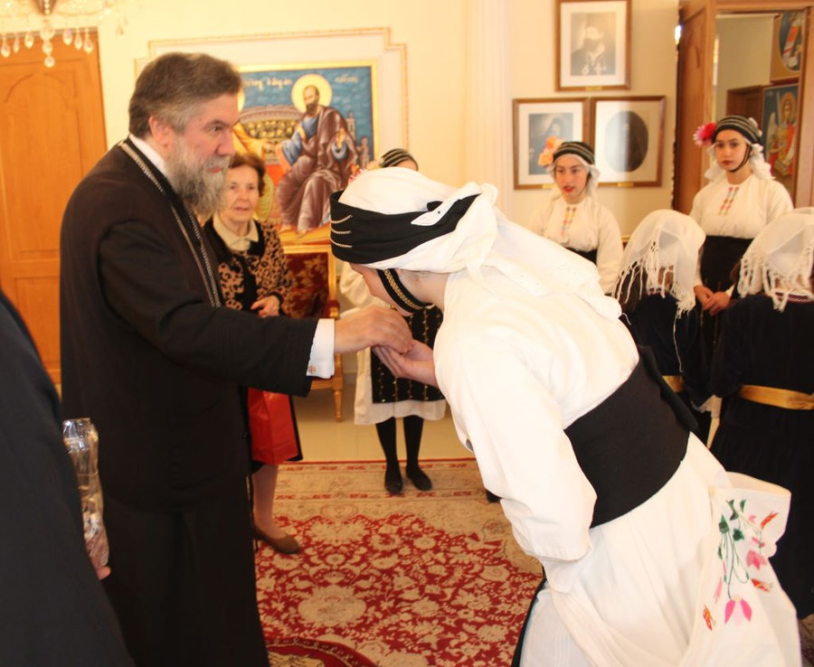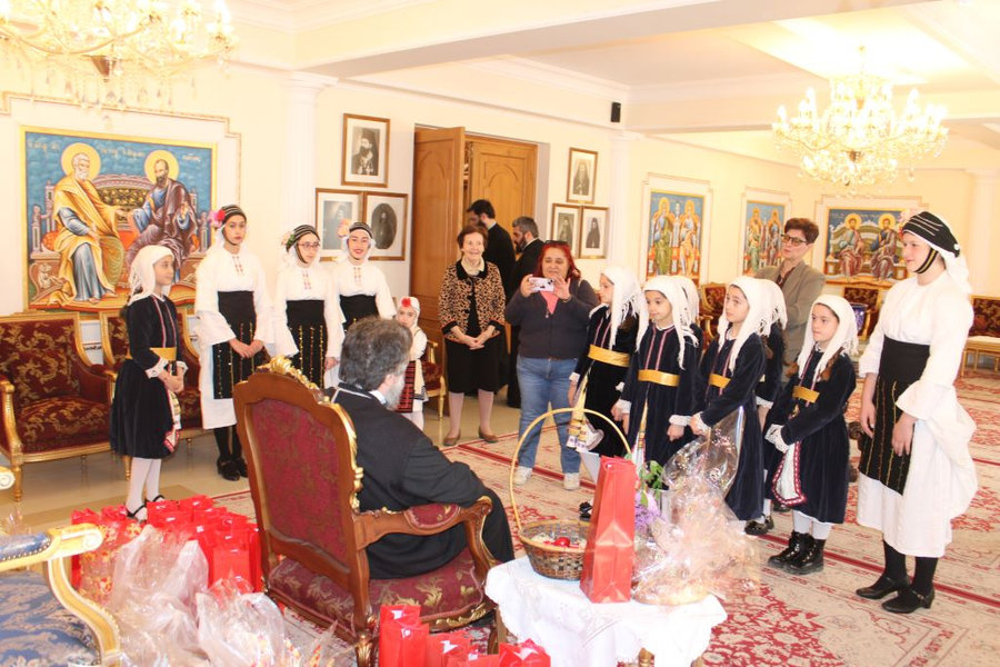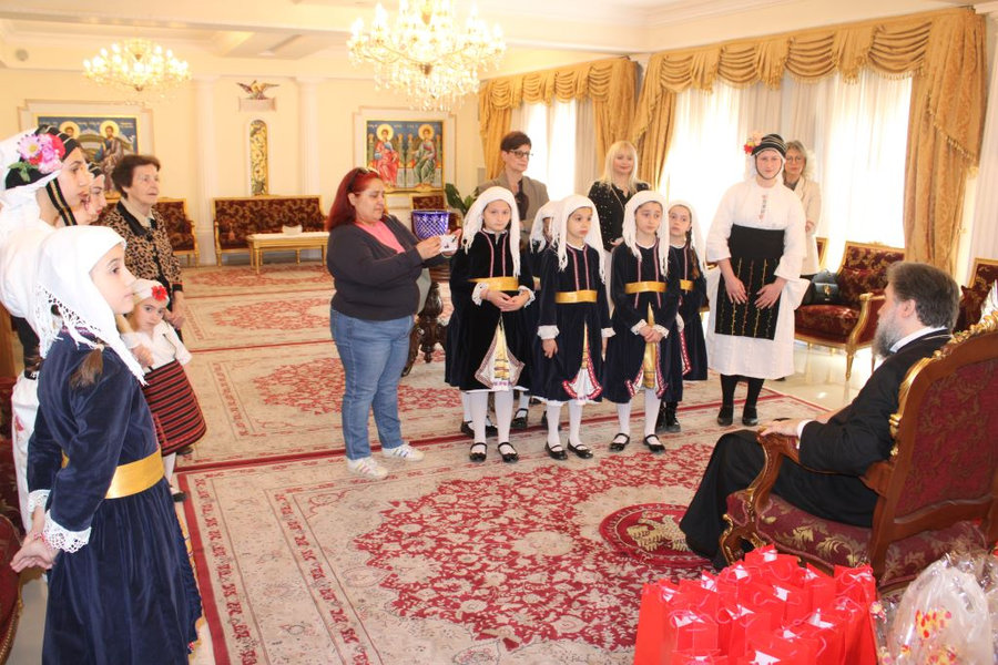 Ακολούθως, στις 11:30 το πρωί, τα μέλη του Εργαστηρίου Λαογραφικών Μελετών και Παραδοσιακών Χορών «Ο ΠΥΡΡΟΣ», της Θρακικής Εστίας και του Πανηπειρωτικού Συλλόγου Ν. Σερρών έψαλαν στον Σεβασμιώτατο με τις γλυκόλαλες φωνές τους τα πατροπαράδοτα κάλαντα του Αγ. Λαζάρου.