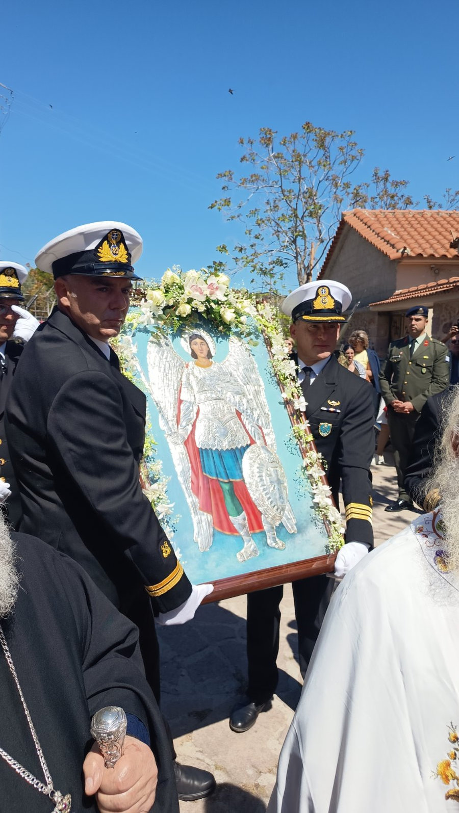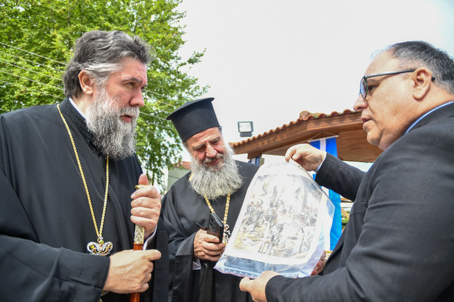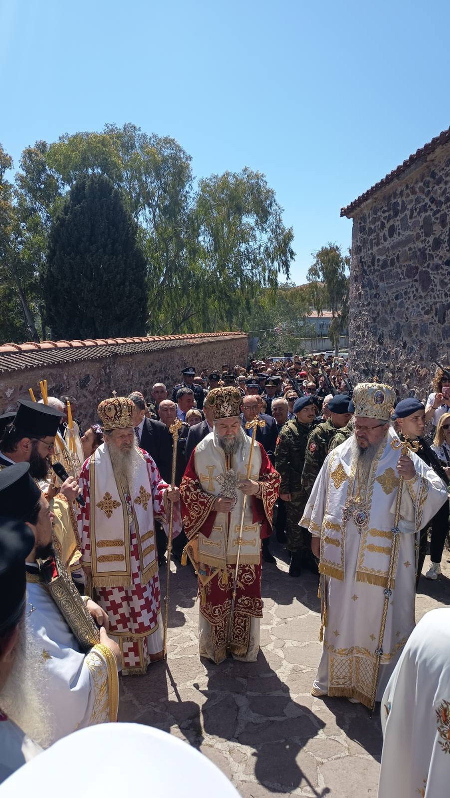 Όσον δε αφορά στην χρήση στρατιωτικού οχήματος, που ευγενώς παρεχώρησε η 10η Μηχανοποιημένη Ταξιαρχία Σερρών μαζί με τιμητικό άγημα στρατιωτών, χειρονομία για την οποία ευγνωμόνως ευχαριστούμε, αυτό δεν συνιστά πρωτόγνωρη πρακτική καθώς έχει συμβεί και κατά το παρελθόν, ως λ.χ. στην περιφορά της ιεράς εικόνος των Παμμεγίστων Ταξιαρχών για πρακτικούς και μόνον λόγους.