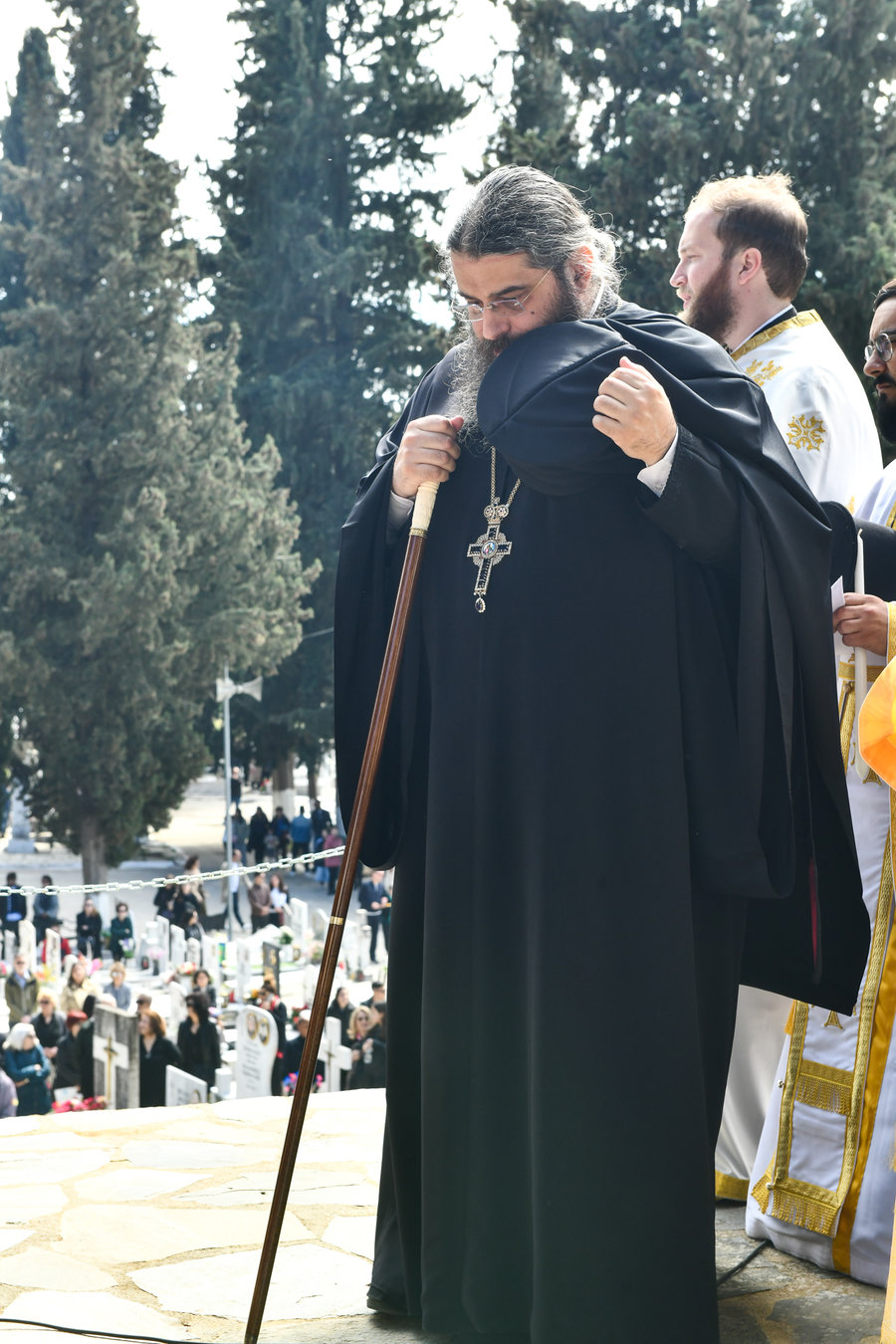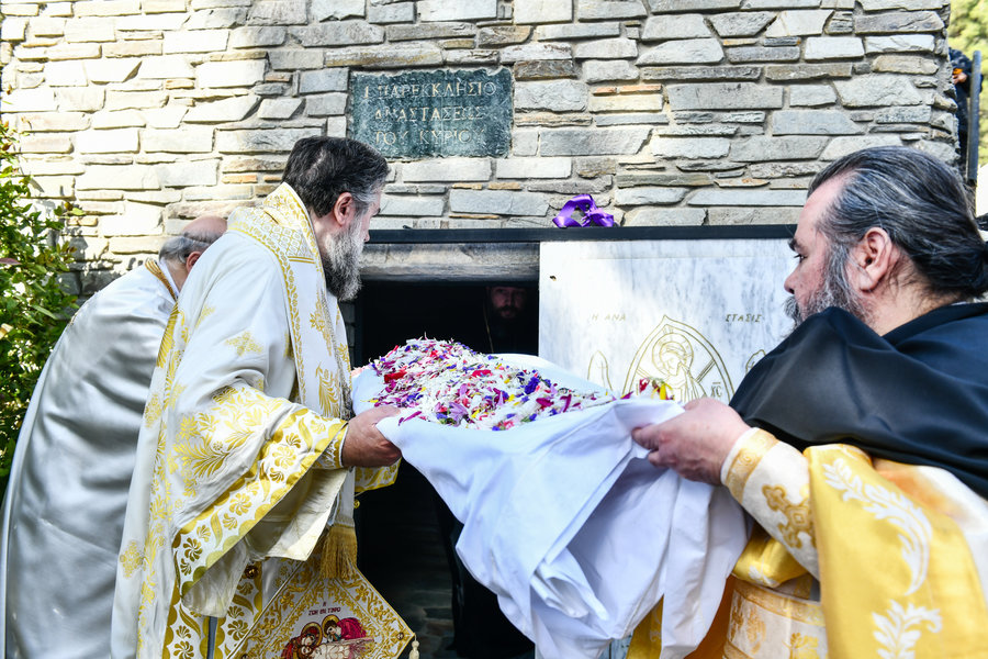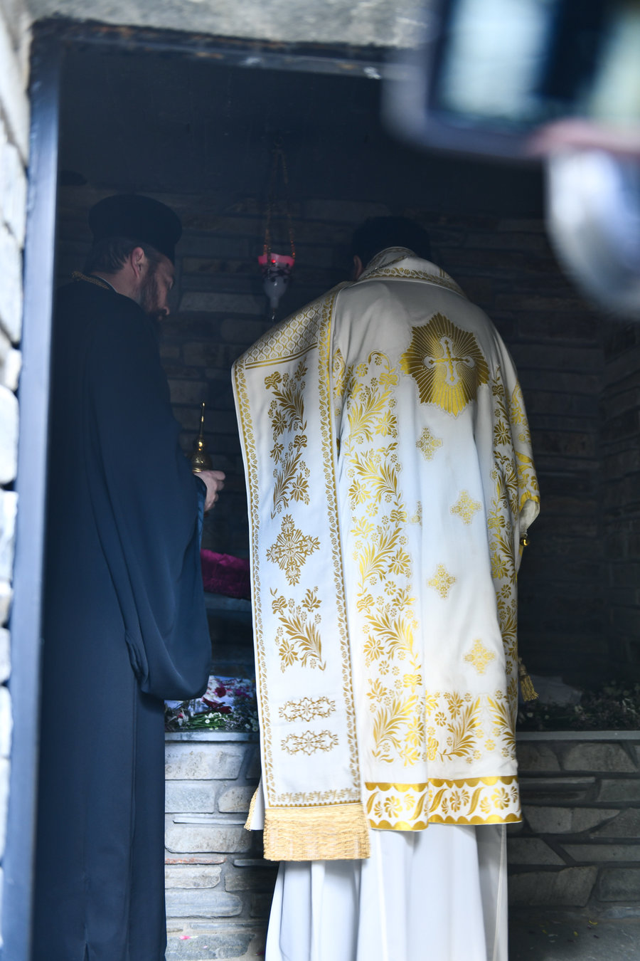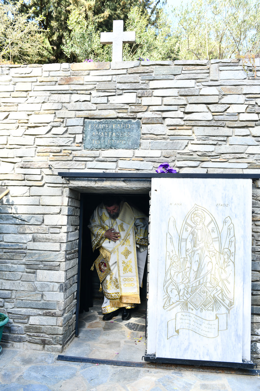 Εν συνεχεία, το αποκαθηλωθέν «Σώμα» του Κυρίου μας οδηγήθηκε λιτανευτικώς στο πλησίον του υπερώου λελατομημένο εκ πέτρας κενοτάφιο. Προ της απολύσεως, ο Σεβασμιώτατος ευχήθηκε υπέρ μακαρίας και αιωνίου αναπαύσεως των ψυχών όλων των κεκοιμημένων αδελφών μας, οι οποίοι, όπως χαρακτηριστικώς ετόνισε, αναμένουν την κοινή Ανάσταση λουσμένοι στο ανέσπερο Φως της αιωνιότητος, που μόνον ο Χριστός, η Ανάσταση και η Ζωή μας χαρίζει.