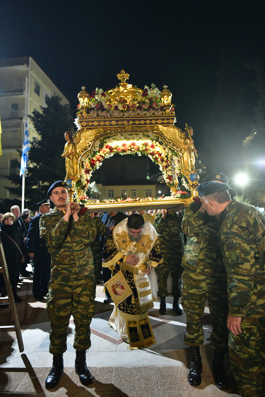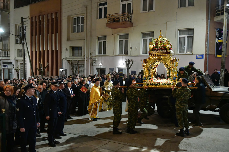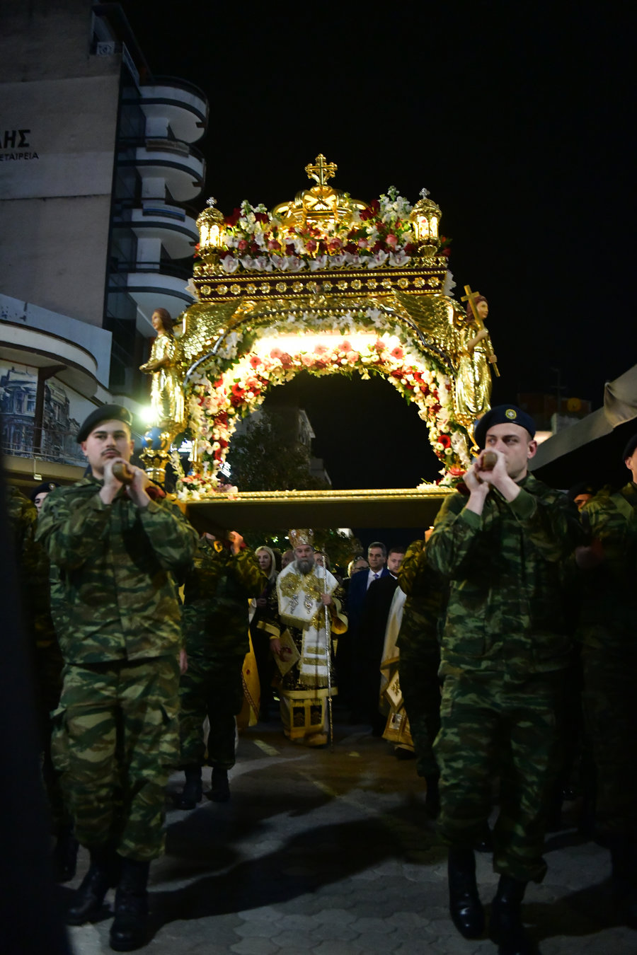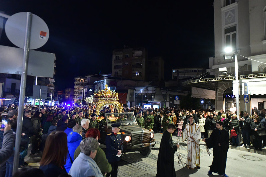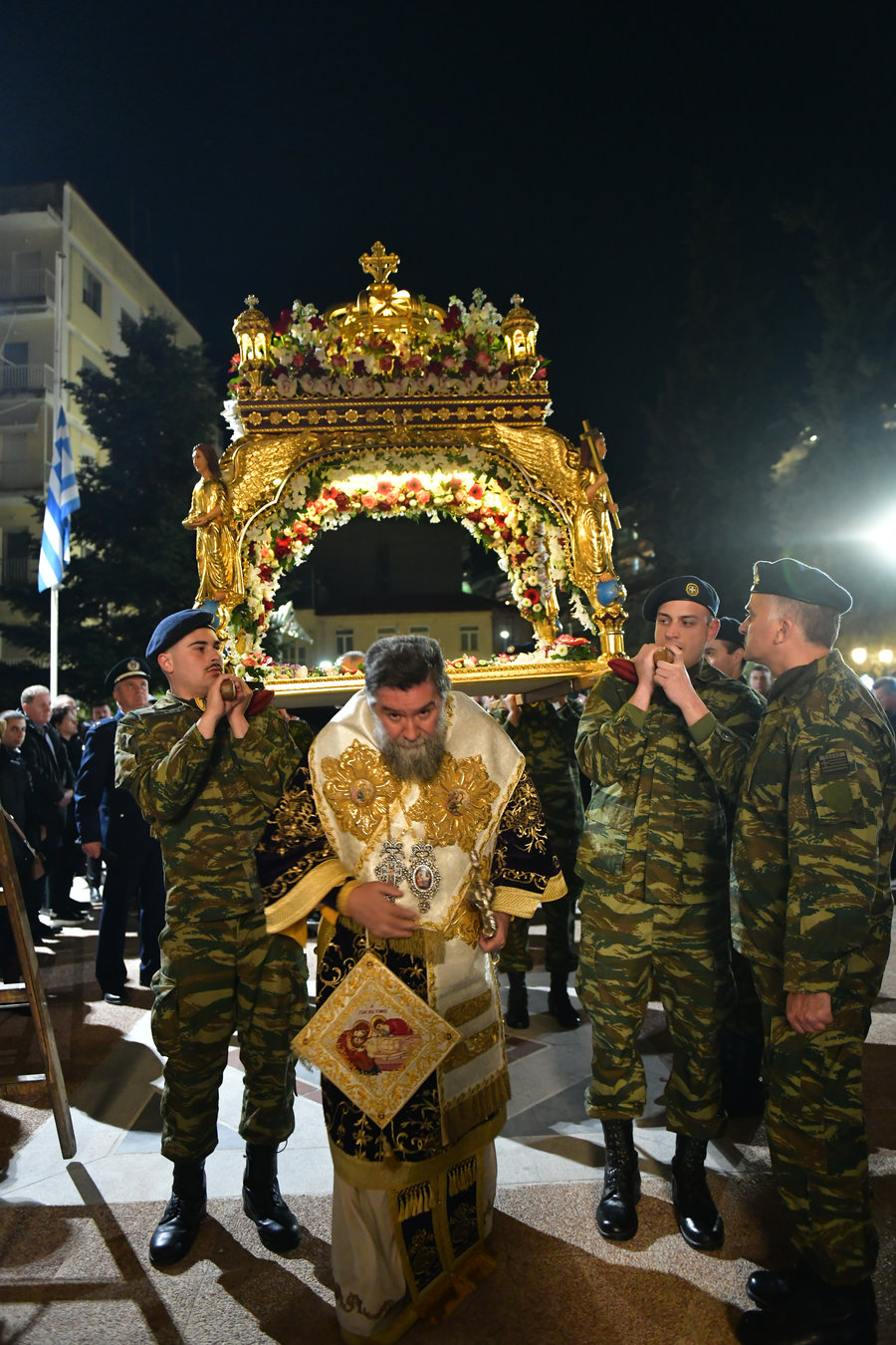 Μετά την έξοδο και την λιτάνευση του ιερού Κουβουκλίου, πραγματοποιήθηκε, στις 9:30 το βράδυ, η καθιερωμένη συνάντηση των Επιταφίων των κεντρικών ιερών Ναών της πόλεως των Σερρών στην πλατεία «ΕΛΕΥΘΕΡΙΑΣ» με την πληθωρική συμμετοχή χιλιάδων πιστού λαού του Θεού.