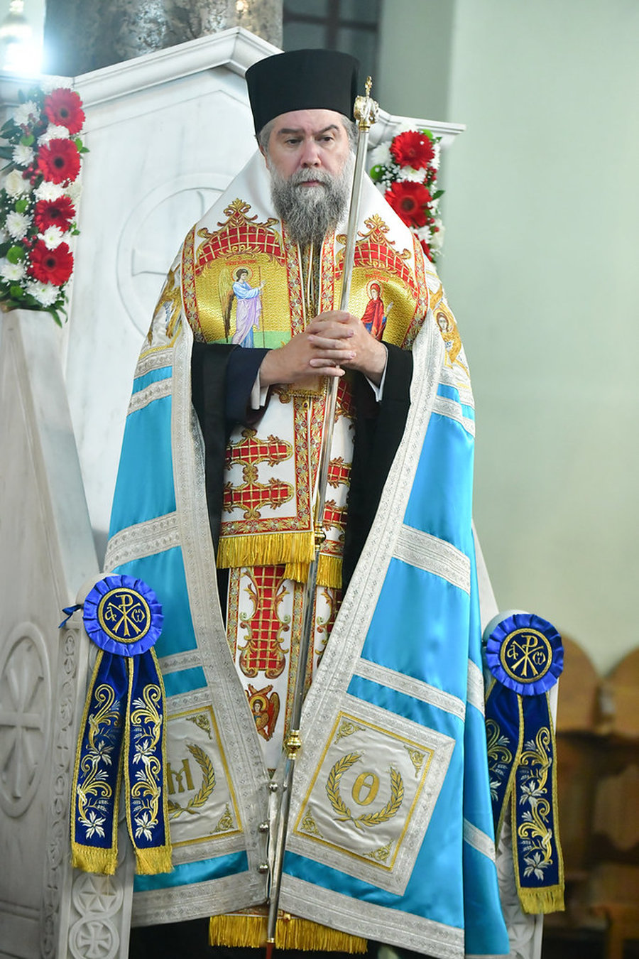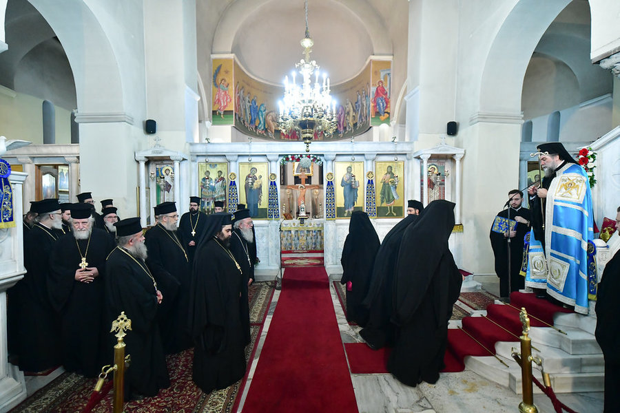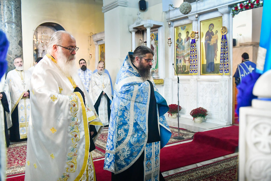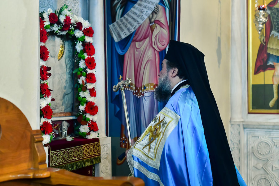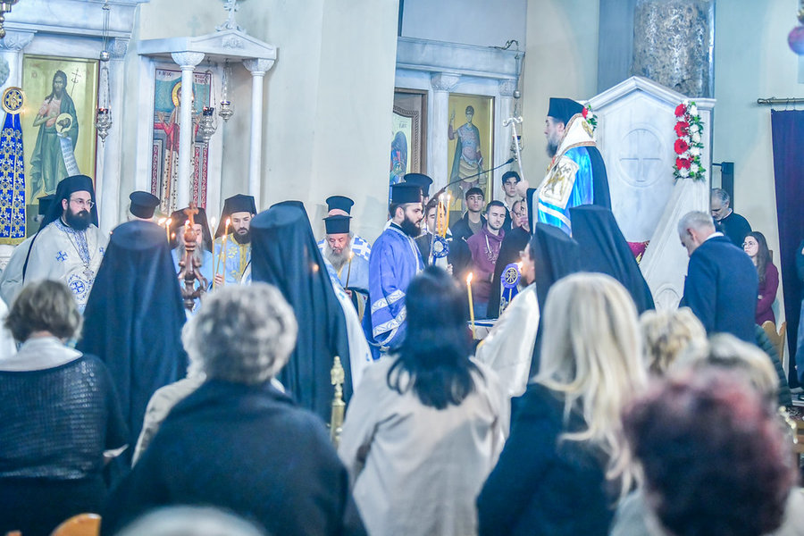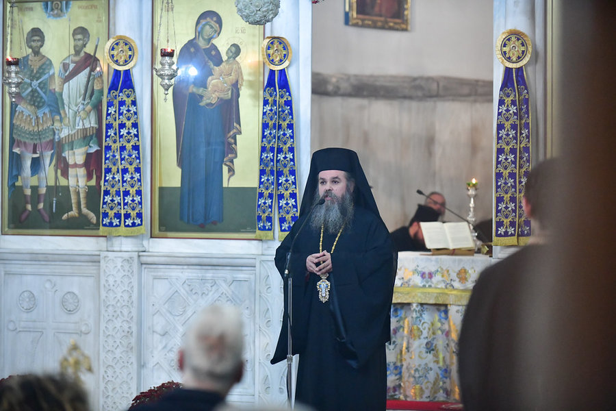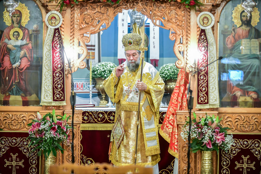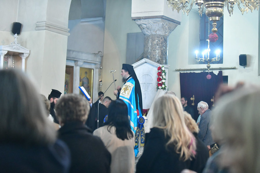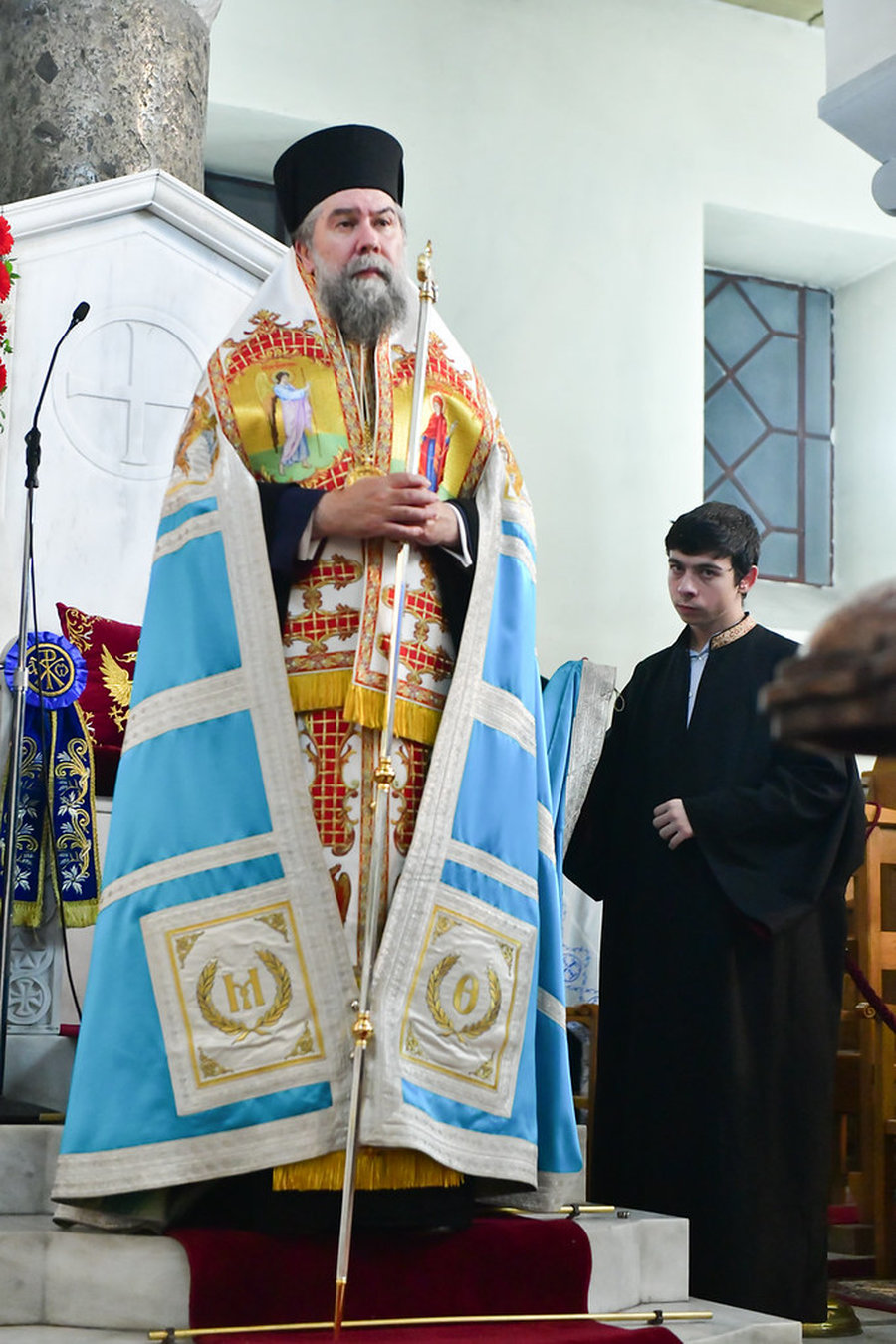 Προ της απολύσεως της ιεράς ακολουθίας, στην εμπνευσμένη, από τον λόγο του Αγ. Ιωάννου του Δαμασκηνού: «Ὅθεν δικαίως καὶ ἀληθῶς Θεοτόκον τὴν ἁγίαν Μαρίαν ὀνομάζομεν· τοῦτο γὰρ τὸ ὄνομα ἅπαν τὸ μυστήριο τῆς οἰκονομίας συνίστησι», (Έκδοσις ακριβής της Ορθοδόξου Πίστεως Γ’, 12 (56) (PG 94, 1029C), σύντομη ομιλία του, ο Σεβ. κ. Θεολόγος ανέφερε μεταξύ άλλων και τα εξής: