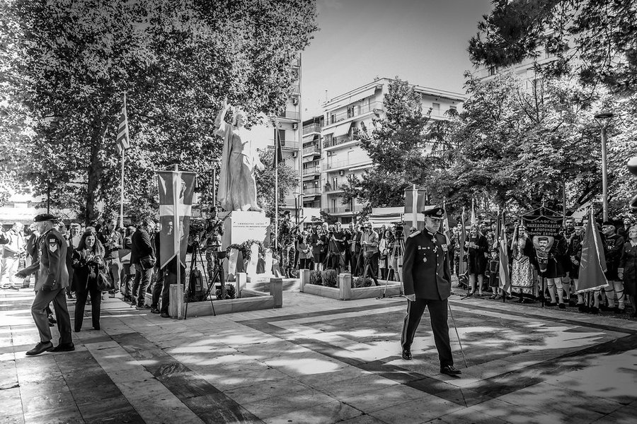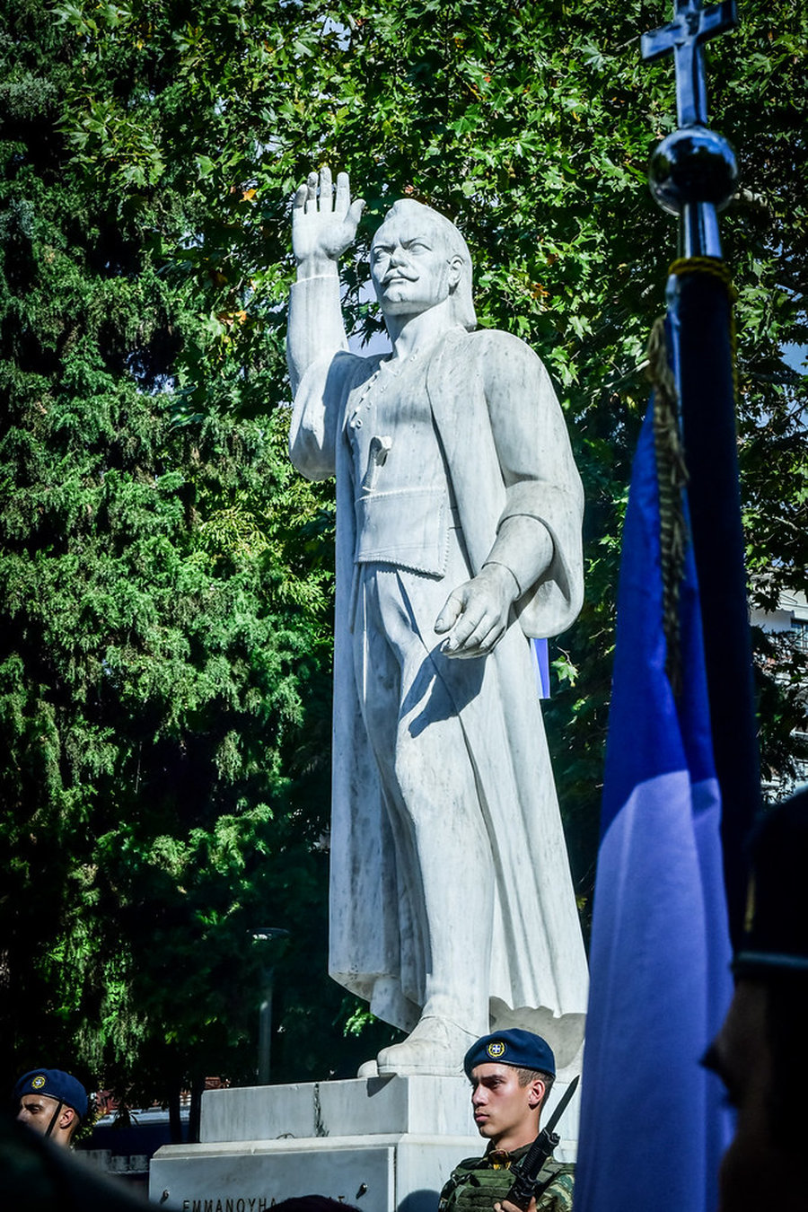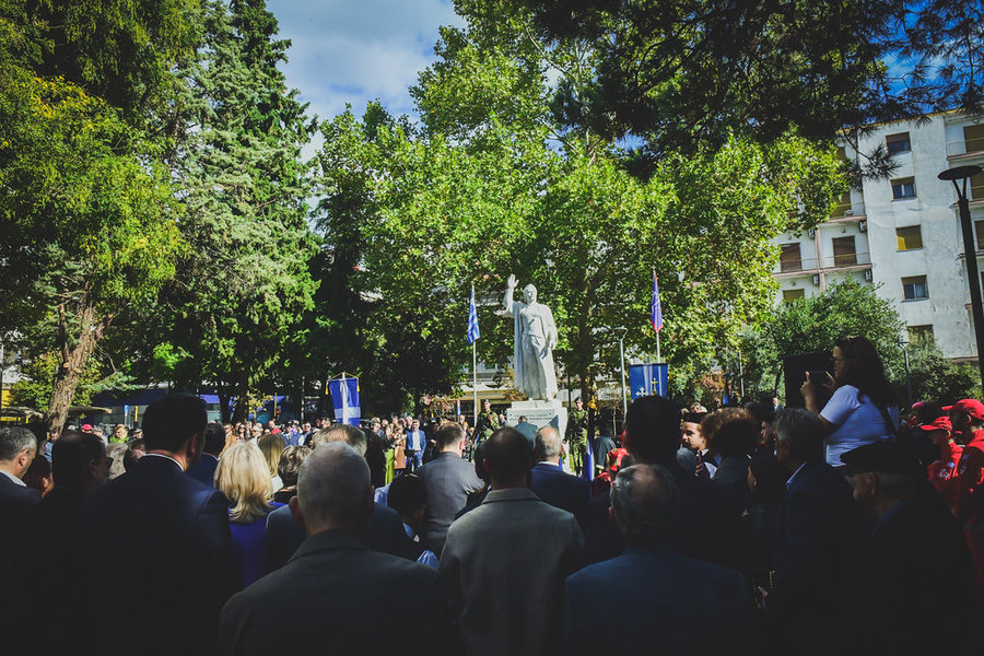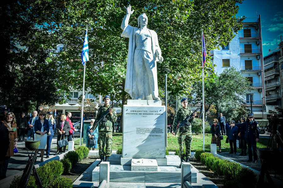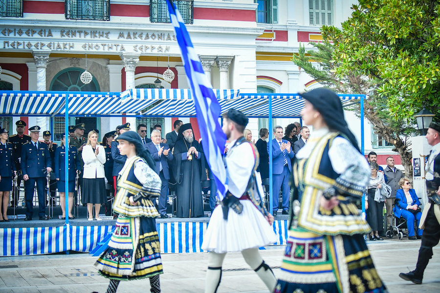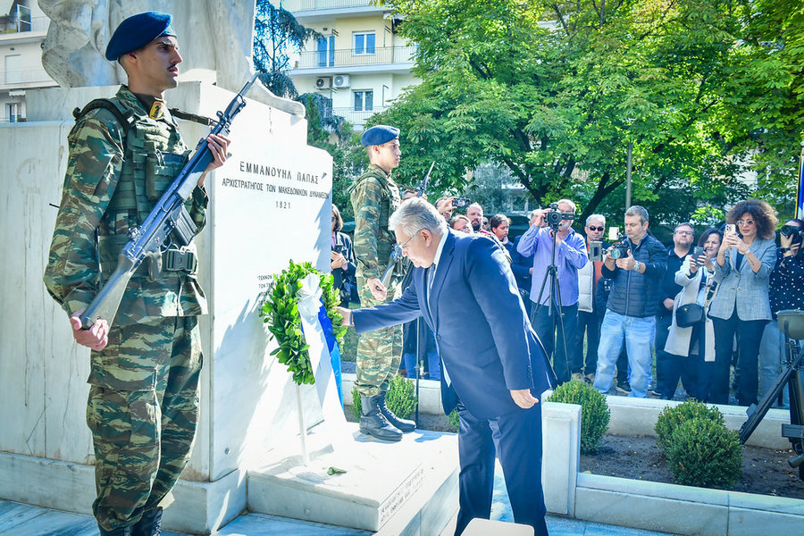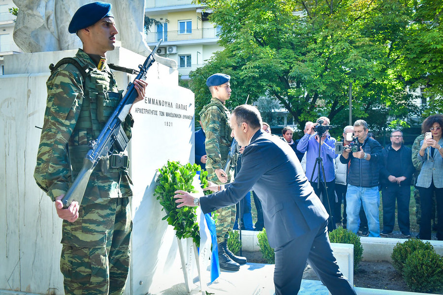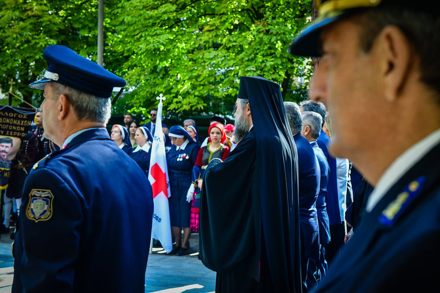 Ακολούθως, ο Σεβασμιώτατος, μαζί με τον ιερό κλήρο, τους άρχοντες και τον πιστό λαό του Θεού, μετέβησαν εν πομπή, στον χώρο της πλατείας «Ελευθερίας» της πόλεως των Σερρών. Εκεί, ενώπιον του ανδριάντα του Σερραίου ήρωος της ελληνικής Επαναστάσεως του 1821, Αρχιστρατήγου Εμμ. Παπά, εψάλη επιμνημόσυνη δέηση, κατετέθησαν στέφανοι, τηρήθηκε ενός λεπτού σιγή στην μνήμη όλων όσων θυσιάσθηκαν για την ελευθερία της Πατρίδος και εψάλη ο εθνικός μας Ύμνος.