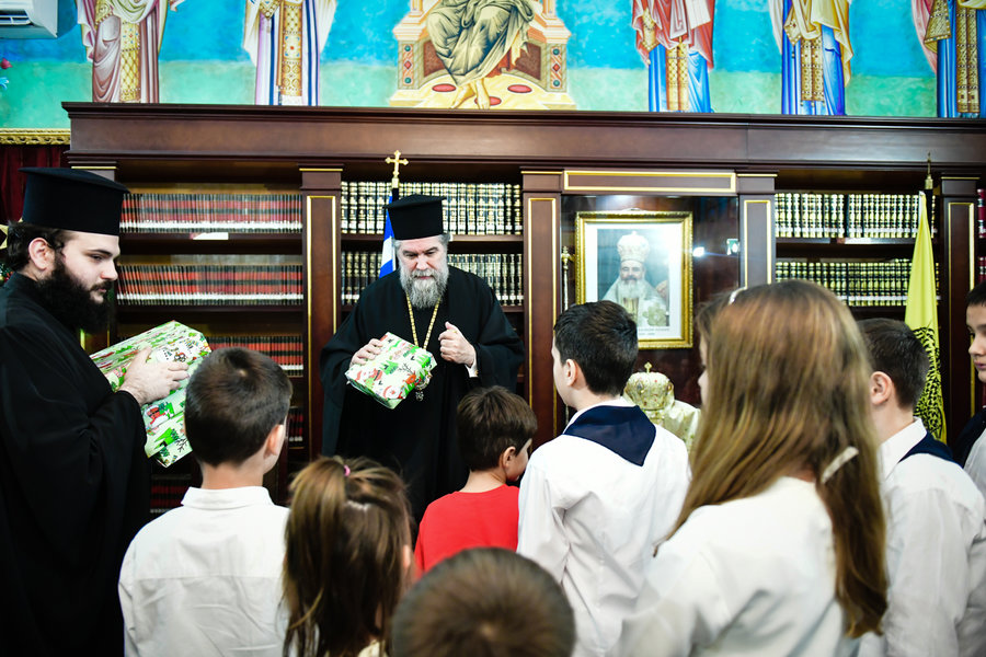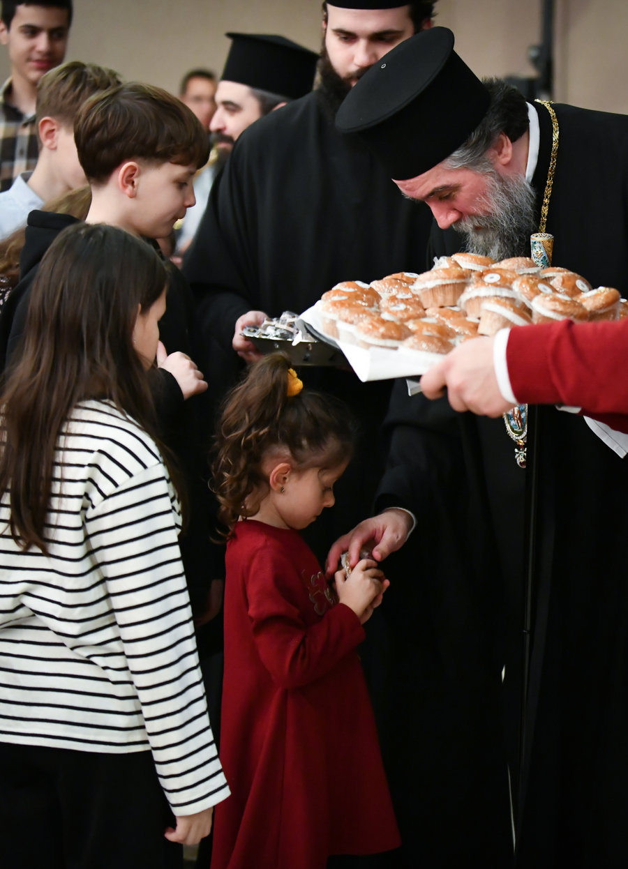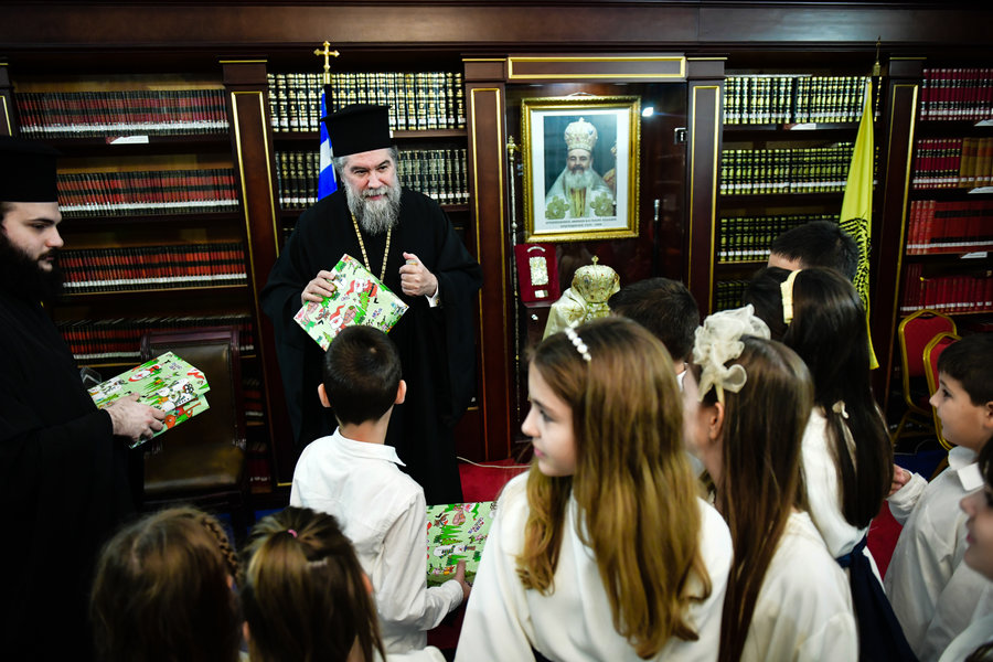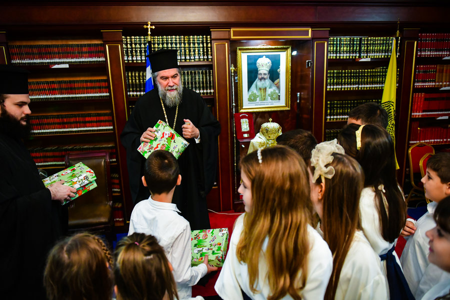 Τα παιδιά της νεανικής Χορωδίας «ΑΓΓΕΛΩΝ ΦΩΝΕΣ» της Ιεράς Μητροπόλεως Σερρών και Νιγρίτης, καθώς και όλα τα παιδιά έψαλαν τα κάλαντα των Φώτων στον πνευματικό τους Πατέρα και του ευχήθηκαν για τον καινούργιο χρόνο, ευχαριστώντας τον με τον δικό τους τρόπο, για την έμπρακτη αγάπη του στις οικογένειές τους. Ο Σεβασμιώτατος ομίλησε με πατρική στοργή στα παιδιά, προσφέροντας σε όλα γλυκίσματα και τα δώρα τους.