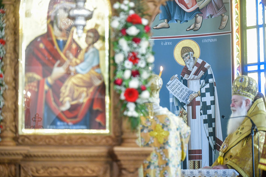 «Εντός του ιερού περιβόλου της Εκκλησίας μας αποκτούμε, εκτός των άλλων, κυρίως στο πρόσωπο των αγίων μας, ως του σήμερον λαμπρώς εορταζομένου Αγ. Σπυρίδωνος, πείρα του τι είναι πραγματική αγάπη και θυσιαστικό φρόνημα, που θεμελιώνονται στην αγάπη στον Χριστό, στην αλήθειά Του, στην προς αλλήλους εκτίμηση και στον αμοιβαίο σεβασμό, ως εικόνων του πλαστουργού Θεού μας. Αυτής της πνευματικής χαρμονής, μέτοχοι και κοινωνοί υπάρχουμε σήμερον άπαντες, τόσο οι Σεβ. αδελφοί Αρχιερείς, όσο και ο ιερός μας Κλήρος και ο φιλάγιος λαός του Θεού.